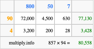 Below is an illustration showing you how to calculate 857 times 94 using the box method, using the instructions above.