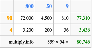Below is an illustration showing you how to calculate 859 times 94 using the box method, using the instructions above.