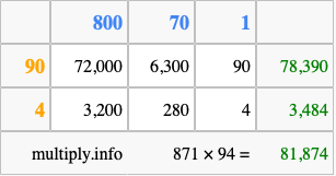 Finally, we add up all the sums we found in step 3 to get our final answer to 871 times 94.