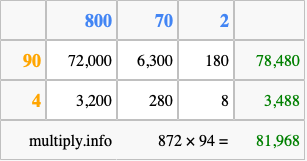 Finally, we add up all the sums we found in step 3 to get our final answer to 872 times 94.