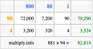 That's all there is to it! As you can see from the box above, the answer to 881 times 94 using the box method is 82,814.