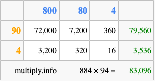 Finally, we add up all the sums we found in step 3 to get our final answer to 884 times 94.