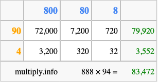That's all there is to it! As you can see from the box above, the answer to 888 times 94 using the box method is 83,472.