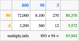 Below is an illustration showing you how to calculate 893 times 94 using the box method, using the instructions above.