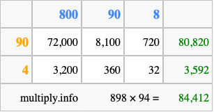 That's all there is to it! As you can see from the box above, the answer to 898 times 94 using the box method is 84,412.