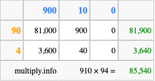 Finally, we add up all the sums we found in step 3 to get our final answer to 910 times 94.