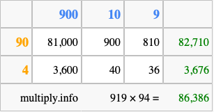 Below is an illustration showing you how to calculate 919 times 94 using the box method, using the instructions above.