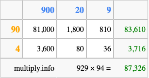 That's all there is to it! As you can see from the box above, the answer to 929 times 94 using the box method is 87,326.