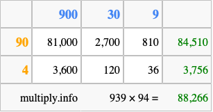 That's all there is to it! As you can see from the box above, the answer to 939 times 94 using the box method is 88,266.