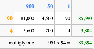 Below is an illustration showing you how to calculate 951 times 94 using the box method, using the instructions above.
