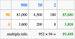 Below is an illustration showing you how to calculate 952 times 94 using the box method, using the instructions above.