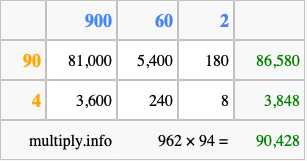 Below is an illustration showing you how to calculate 962 times 94 using the box method, using the instructions above.