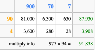Below is an illustration showing you how to calculate 977 times 94 using the box method, using the instructions above.