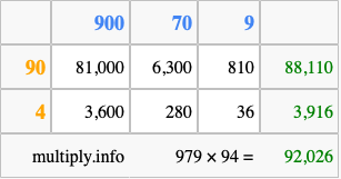 Below is an illustration showing you how to calculate 979 times 94 using the box method, using the instructions above.