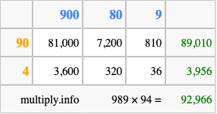 Finally, we add up all the sums we found in step 3 to get our final answer to 989 times 94.