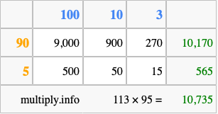 Below is an illustration showing you how to calculate 113 times 95 using the box method, using the instructions above.