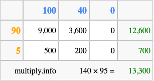Finally, we add up all the sums we found in step 3 to get our final answer to 140 times 95.