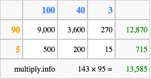 Below is an illustration showing you how to calculate 143 times 95 using the box method, using the instructions above.