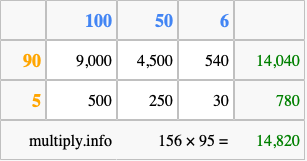 Below is an illustration showing you how to calculate 156 times 95 using the box method, using the instructions above.