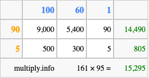 Below is an illustration showing you how to calculate 161 times 95 using the box method, using the instructions above.