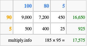 Below is an illustration showing you how to calculate 185 times 95 using the box method, using the instructions above.