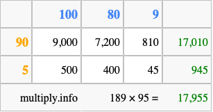 Finally, we add up all the sums we found in step 3 to get our final answer to 189 times 95.