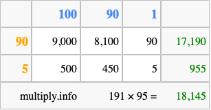 Below is an illustration showing you how to calculate 191 times 95 using the box method, using the instructions above.