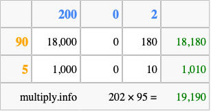 Below is an illustration showing you how to calculate 202 times 95 using the box method, using the instructions above.