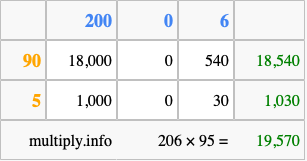 Below is an illustration showing you how to calculate 206 times 95 using the box method, using the instructions above.
