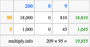 Finally, we add up all the sums we found in step 3 to get our final answer to 209 times 95.