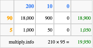 That's all there is to it! As you can see from the box above, the answer to 210 times 95 using the box method is 19,950.