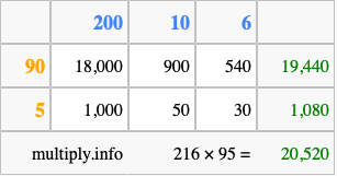Finally, we add up all the sums we found in step 3 to get our final answer to 216 times 95.