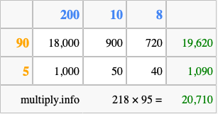 That's all there is to it! As you can see from the box above, the answer to 218 times 95 using the box method is 20,710.
