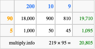 Below is an illustration showing you how to calculate 219 times 95 using the box method, using the instructions above.