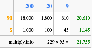 Below is an illustration showing you how to calculate 229 times 95 using the box method, using the instructions above.