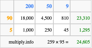 Finally, we add up all the sums we found in step 3 to get our final answer to 259 times 95.