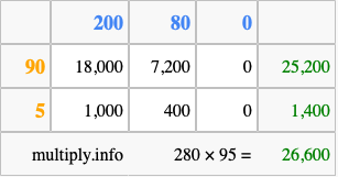 Below is an illustration showing you how to calculate 280 times 95 using the box method, using the instructions above.