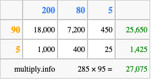 Finally, we add up all the sums we found in step 3 to get our final answer to 285 times 95.