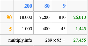 That's all there is to it! As you can see from the box above, the answer to 289 times 95 using the box method is 27,455.
