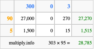 Finally, we add up all the sums we found in step 3 to get our final answer to 303 times 95.