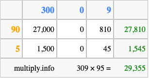 Finally, we add up all the sums we found in step 3 to get our final answer to 309 times 95.