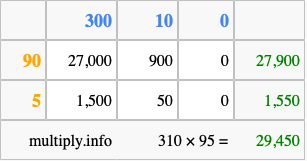 Below is an illustration showing you how to calculate 310 times 95 using the box method, using the instructions above.