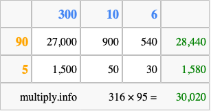 Below is an illustration showing you how to calculate 316 times 95 using the box method, using the instructions above.