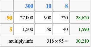 Finally, we add up all the sums we found in step 3 to get our final answer to 318 times 95.