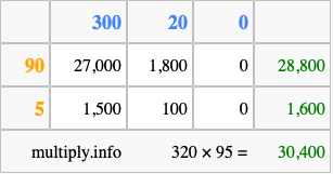 Finally, we add up all the sums we found in step 3 to get our final answer to 320 times 95.