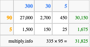 Finally, we add up all the sums we found in step 3 to get our final answer to 335 times 95.
