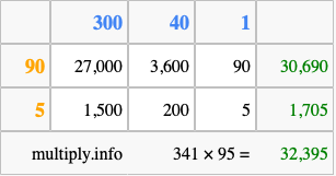 Finally, we add up all the sums we found in step 3 to get our final answer to 341 times 95.