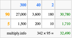Finally, we add up all the sums we found in step 3 to get our final answer to 342 times 95.