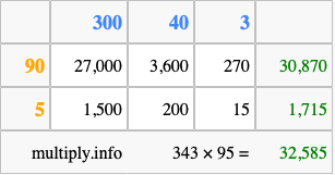 That's all there is to it! As you can see from the box above, the answer to 343 times 95 using the box method is 32,585.