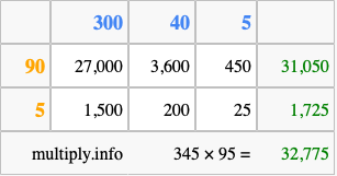 Finally, we add up all the sums we found in step 3 to get our final answer to 345 times 95.